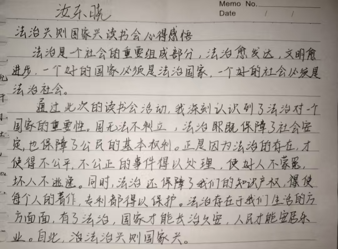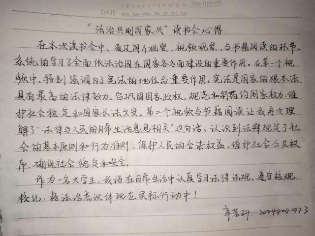 辛若研同学表示:“在本次读书会中,通过图片观察、视频观看与书籍阅读的环节,系统学习了全面依法治国在国家各方面建设的重要作用。作为一名大学生,需要在日常生活中认真学习法律法规,遵守校纪校规,将法治意识体现在实际行动中!”