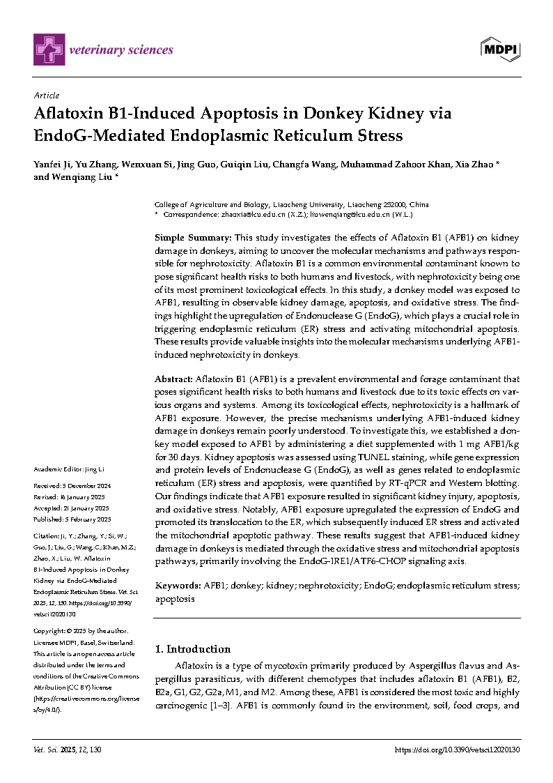 我院2022级动物学专业研究生纪言霏在《Veternary Science》杂志上发表了题为“Aflatoxin B1-Induced Apoptosis in Donkey Kidney via EndoG-Mediated Endoplasmic Reticulum Stress”的研究论文,指导教师为刘文强教授、赵霞博士。