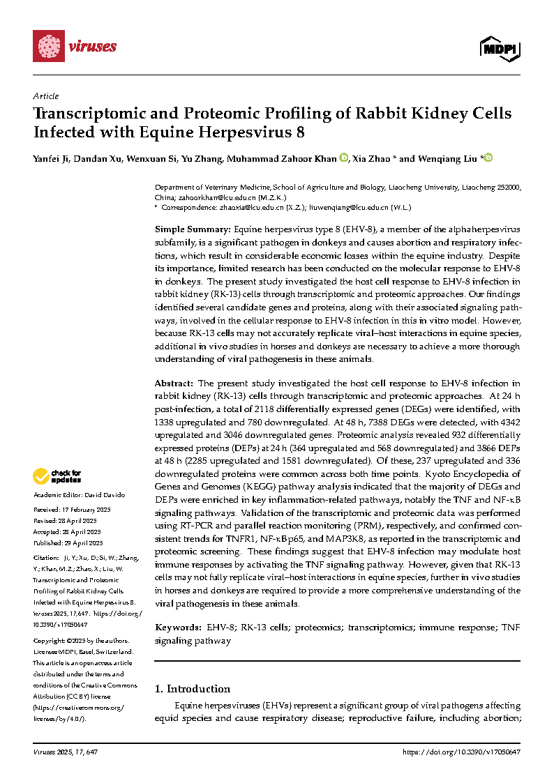 我院2022级动物学专业研究生纪言霏在《Viruses-Basel》杂志上发表了题为“Transcriptomic and Proteomic Profiling of Rabbit Kidney Cells Infected with Equine Herpesvirus 8”的研究论文,指导教师刘文强教授、赵霞博士。