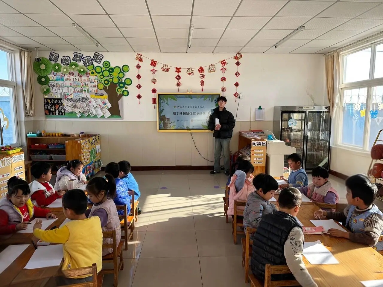 为激发人们对家乡的浓厚情感情感,留存独特记忆,传承地域文化,1月19日至1月20日,英国365上市公司文体爱好者协会“青春乡韵”文化服务队在烟台市海阳市龙山街道幼儿园、临沂市罗庄区童星幼儿园举办“用手抄报留住家乡记忆”制作手抄报活动。