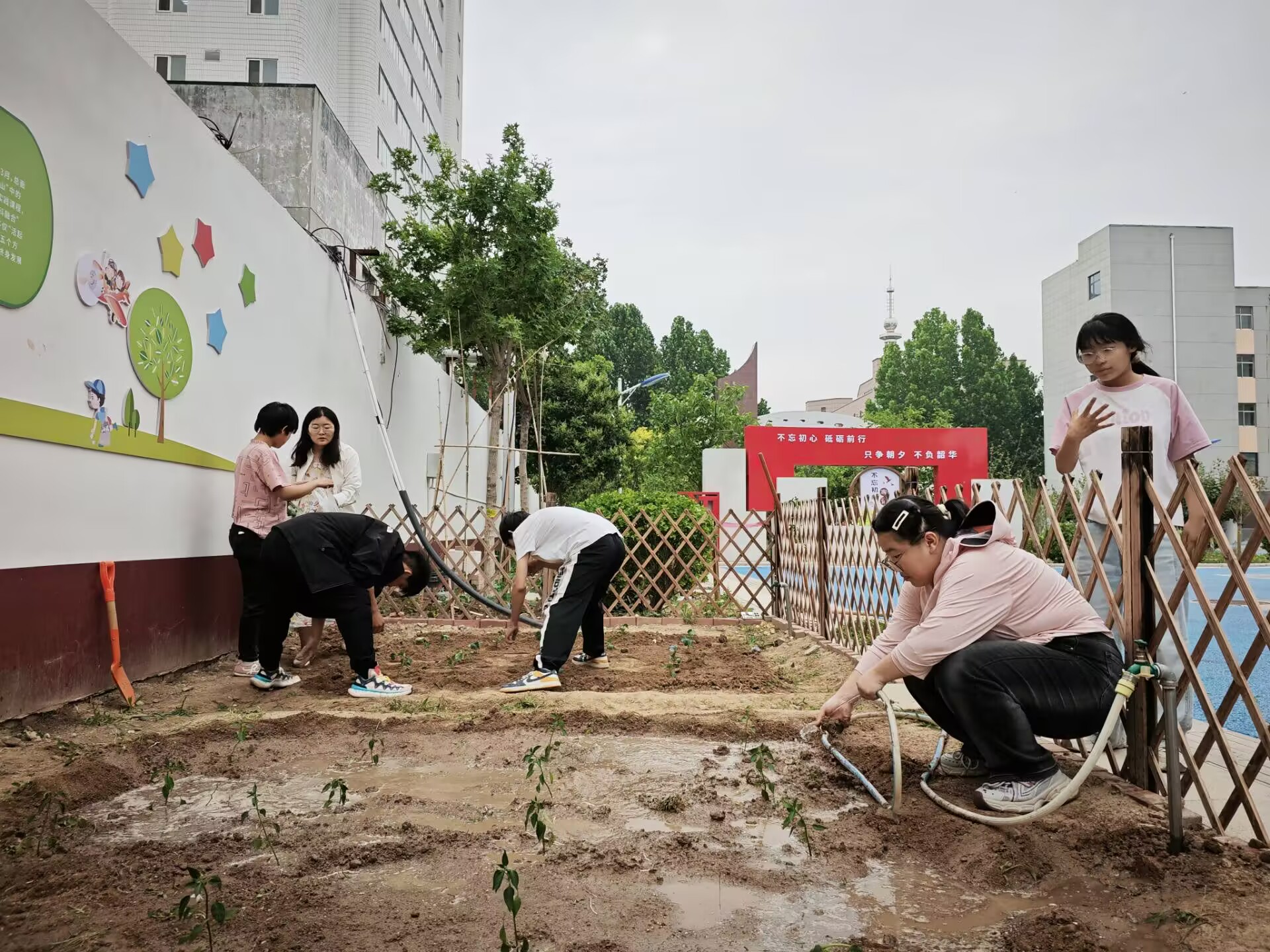 在浇水养护环节,志愿者全程跟进指导,通过 “一对一” 教学方式,向学生示范科学的浇水方法,并结合植物生长周期特点,引导学生观察记录土壤湿度、叶片状态等生长要素,培养学生的劳动观察能力。活动尾声,全体志愿者与学生在种植园前合影留念。