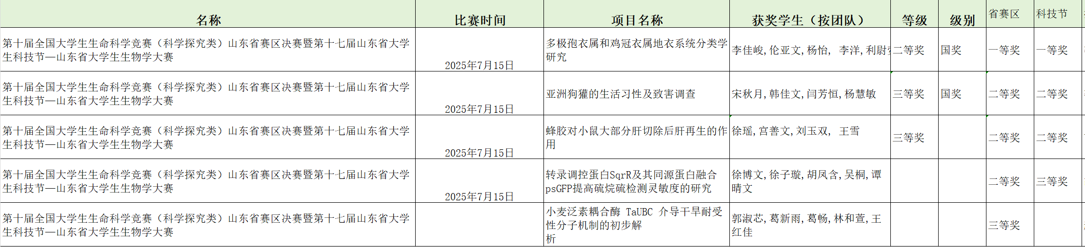 本次大赛由山东省科学技术协会、山东省教育厅等单位联合主办,吸引了全省数十所高校的数百支队伍参赛。我院5支参赛团队在此次赛事中表现出色,凭借扎实的专业知识、创新的研究思路和严谨的科学态度,斩获佳绩,为学院和学校赢得了显著荣誉。我院被推荐获全国大学生生命科学竞赛(2025,科学探究类)国家级奖项二等奖1项、三等奖2项,获省级奖项一等奖1项、二等奖3项、三等奖1项,并获得山东省大学生生物学大赛一等奖1项、二等奖2项、三等奖1项。