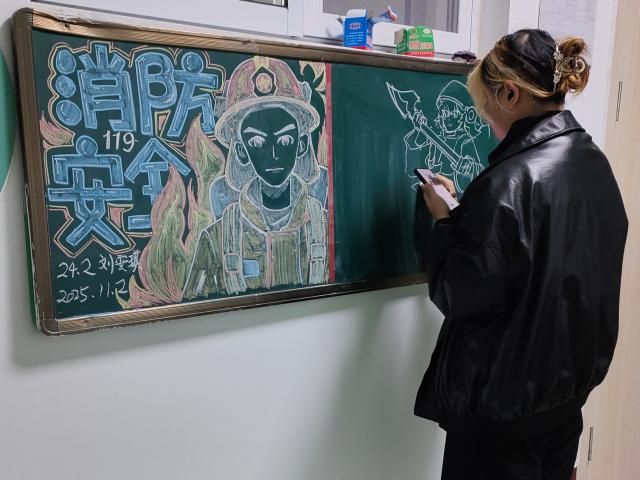 同学们紧扣“消防知识”、“校园安全”等主题,充分发挥创造力与想象力,用彩色粉笔精心勾勒出一幅幅色彩鲜明的黑板报,在这其中包含漫画、简笔画、标语等多种元素,把抽象的消防知识转化为直观的艺术表达。这种将消防知识与艺术美感紧密结合的方式,成功地让严肃的安全话题变得生动有趣,使消防知识以一种学生喜闻乐见的方式潜移默化地进入他们的脑海中。在活动现场,同学们的绘画吸引了许多师生驻足观赏。不少同学在作品前交流心得,积极分享自己对消防安全的认识和保障校园安全的想法。其中一位同学深有感触地表示:“这次的活动不仅让我系统学习了消防知识,而且也意识到了校园消防安全的重要。”