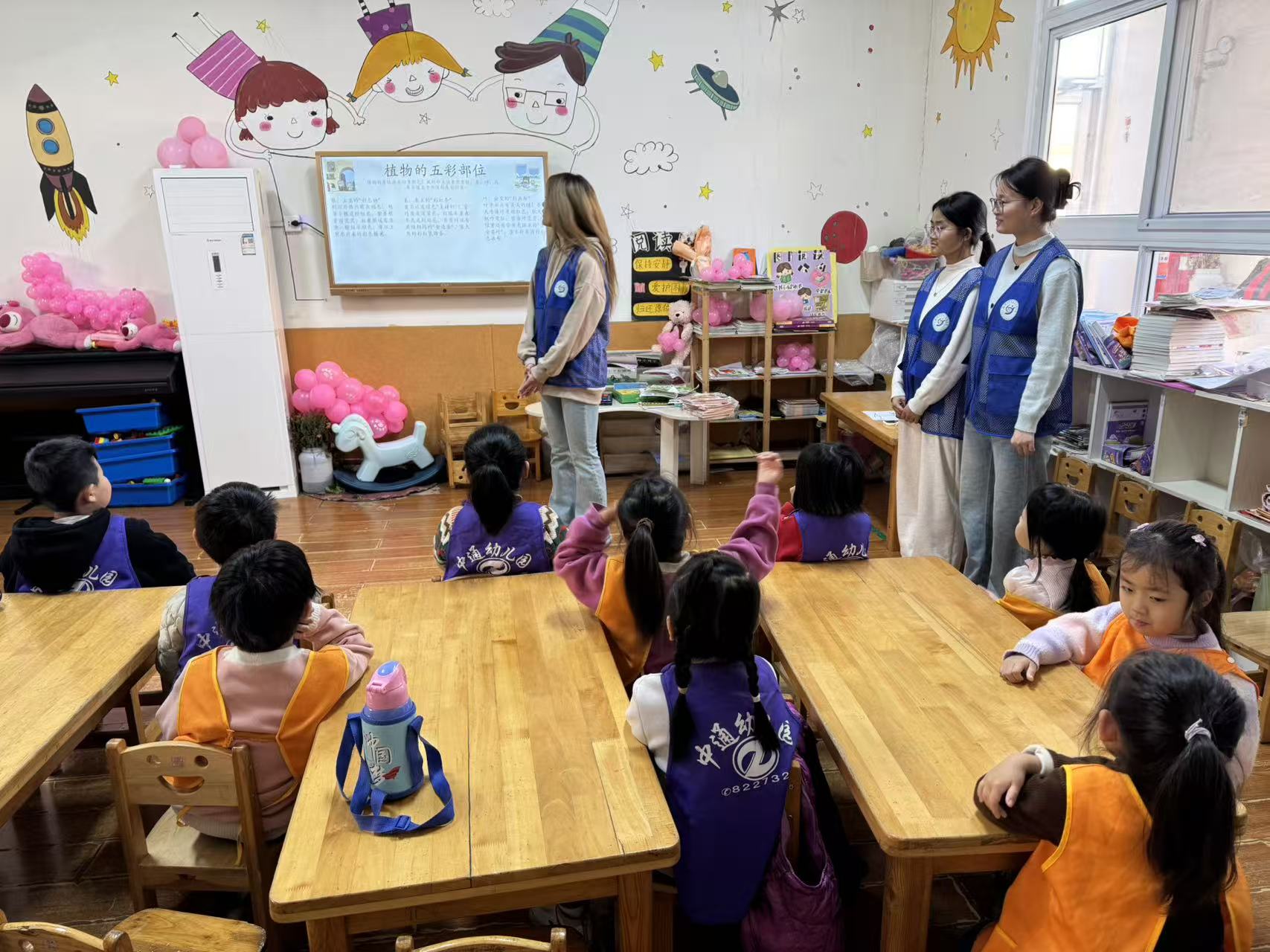 活动伊始,志愿者们通过实物展示吸引小朋友们的注意力,并围绕植物颜色展开讲解。他们用浅显易懂的语言、生动有趣的方式,介绍了叶绿素让叶片呈现绿色的科学知识,引导小朋友在图片中观察植物颜色的丰富性。接下来,志愿者们通过提问,引导孩子们回忆在路边或公园见过的植物颜色变化。孩子们踊跃举手、积极回答。问答环节巩固了他们对植物颜色的认知,也鼓励他们在日常生活中多观察身边的美好事物。