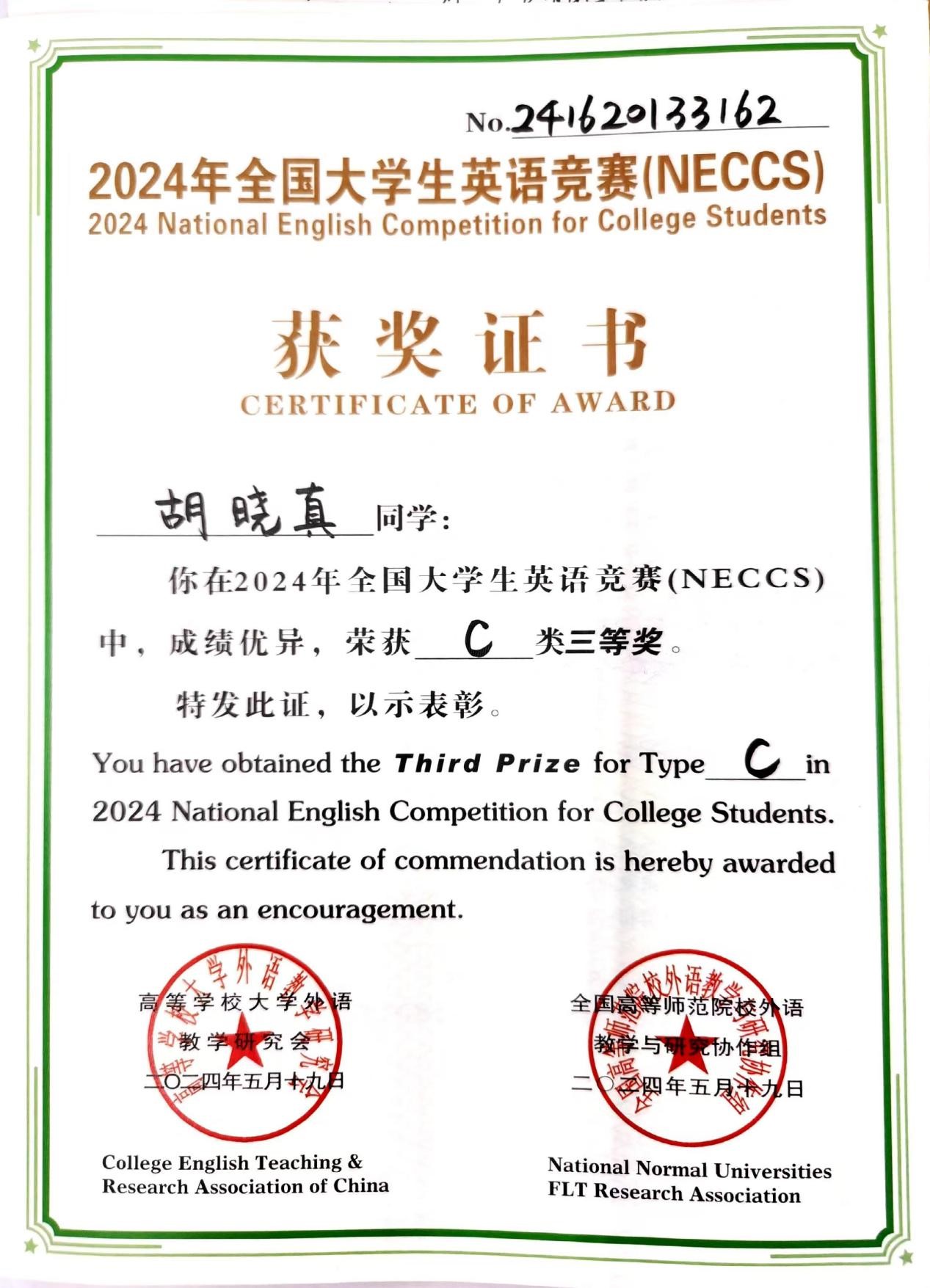 我院胡晓真同学在2024年全国大学生英语竞赛中荣获三等奖,对该获奖同学予以祝贺表彰。