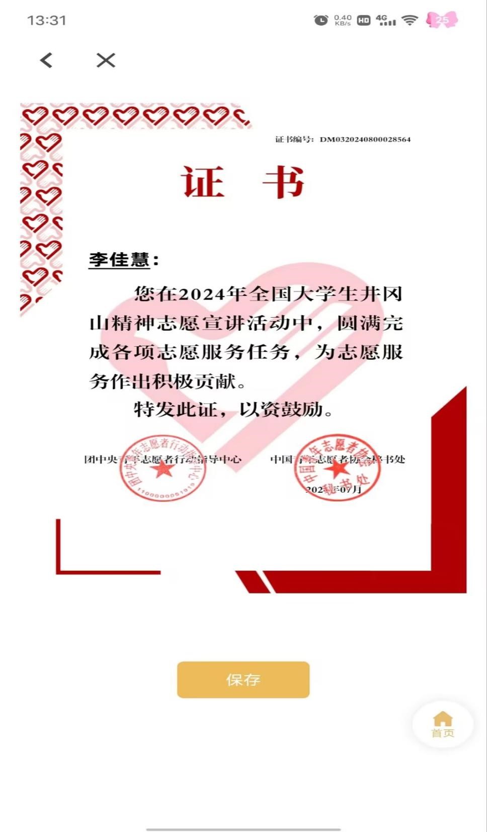 我院李佳慧同学在2024年全国大学生井冈山精神志愿宣讲表现优秀,对该同学予以祝贺表彰。