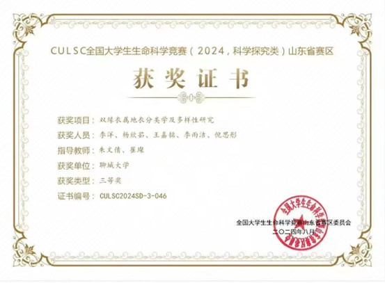 我院王嘉铭同学在CULSC全国大学生生命科学竞赛(2024,科学探究类)山东省赛区中荣获三等奖,对该获奖同学予以祝贺表彰