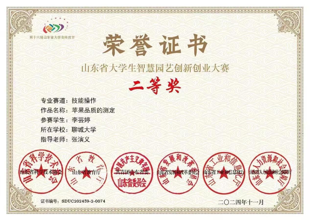 我院李芸婷同学在山东省大学生智慧园艺大赛中荣获二等奖,对该获奖同学予以祝贺表彰。