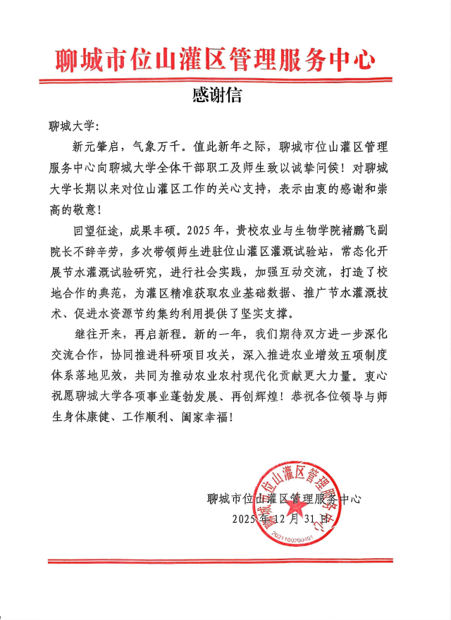 聊城市位山灌区管理服务中心发来感谢信!